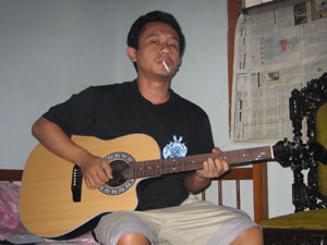 Weekend, gak pulang ke Bandung, mau berkunjung ke rumah teman tapi ybs sedang tidak ada di rumah, jadilah hari Minggu pagi santai di tempat kost. Bangun tidur (agak siang …) trus bikin kopi, mmhh lumayan jadi segar. Mutar lagu dari koleksi mp3 yang ada di laptop yang akhirnya jadi bikin gatel tangan, jadi pengen main gitar. Jadilah saya dengerin musik sambil ngopi & ngudud plus main gitar… Kebetulan gitar baru diganti senarnya pake yang 0.8mm, jadi agak ramah di jari-jariku yang udah lama gak main gitar. (PS. Ini gitar beli di Abang, 390rb, lihat
